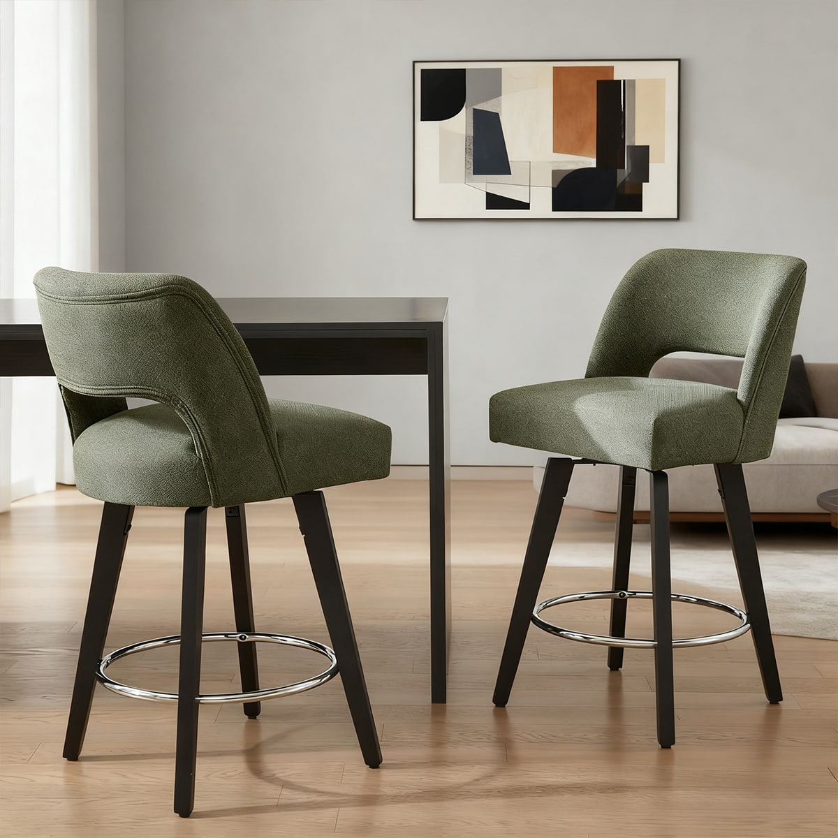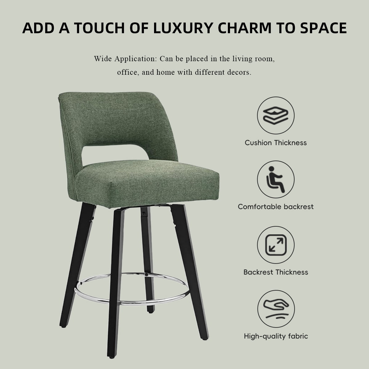 يعيد مقعد DUOMEI Green Swivel Counter Height Bar Stool تعريف الراحة الحديثة من خلال شكله المريح وتنجيده من الكتان الفاخر. مصمم للاستخدام السكني والتجاري، هذا المقعد الدوار 360 درجة يجمع بين مقعد مبطن ناعم مع إطار خشبي قوي ومسند قدم مطلي بالكروم، مما يخلق حلاً فاخرًا ومتينًا للجلوس للمطابخ والحانات والمقاهي.