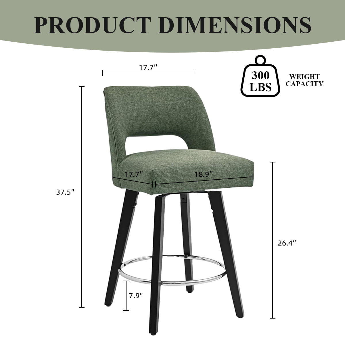 مقعد مرتفع دوار باللون الأخضر الحديث مع مسند ظهر وأرجل معدنية | كراسي بار من الكتان المنجدة لجزيرة المطبخ والحانة المنزلية