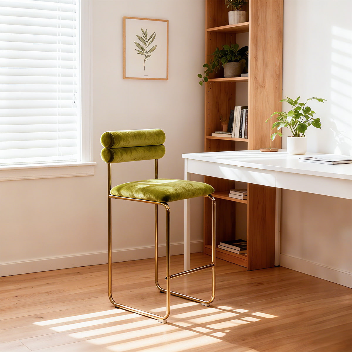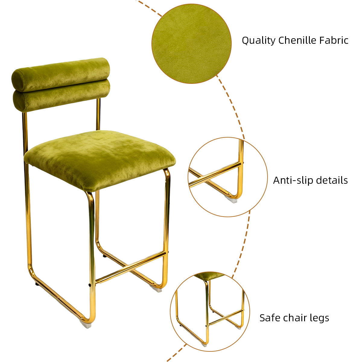 يناسب ارتفاعه 37.4 بوصة طاولات المطبخ القياسية وبارات الطعام، بينما يضمن المقعد مقاس 25.9 بوصة الراحة المثالية للمحادثات الطويلة أو تناول الطعام غير الرسمي. توفر المفروشات المخملية الناعمة تجربة لمس فاخرة، وتضيف الأرجل المطلية بالذهب لمسة راقية. مع وسادة إسفنجية عالية المرونة وقاعدة مضادة للانزلاق، تم تصميم هذا المقعد ليجمع بين الراحة والأناقة والمتانة - وهو مثالي للمساحات المنزلية والتجارية.