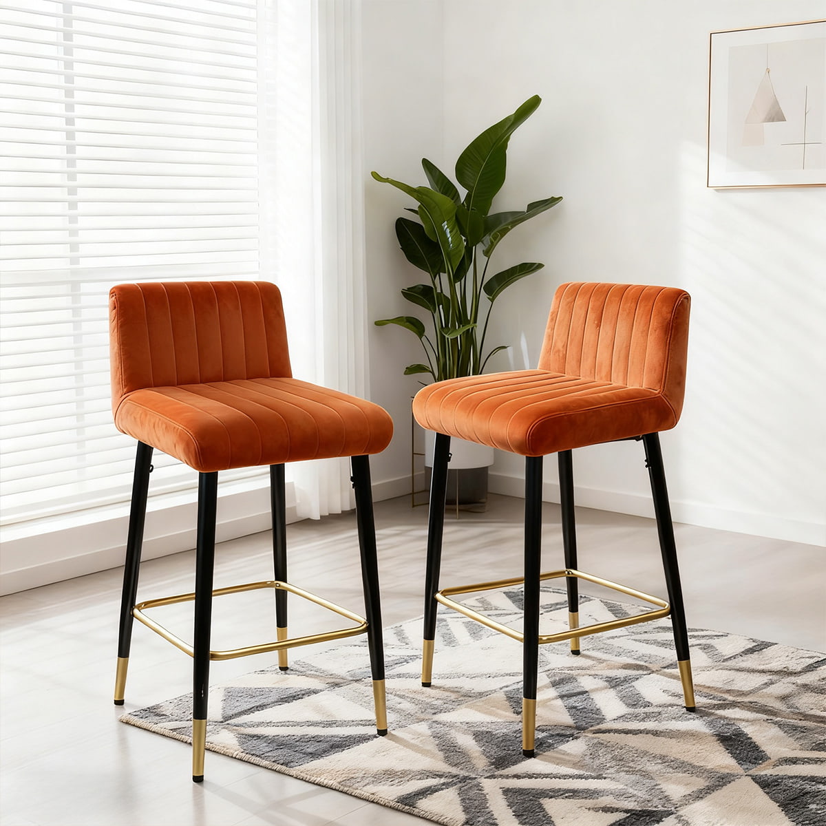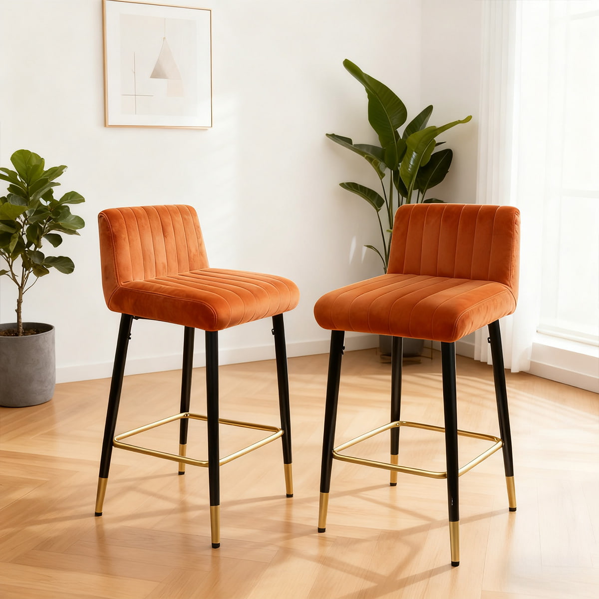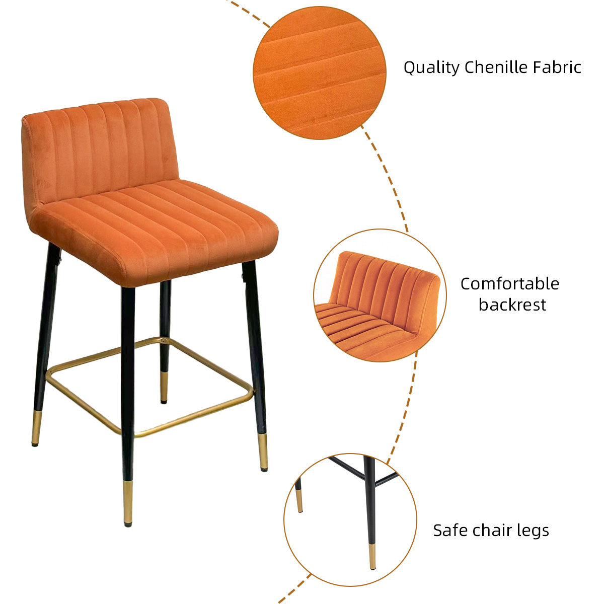 مقعد بار مخملي برتقالي مغرة حديث - كرسي ارتفاع دوار 360 درجة مع أرجل معدنية باللونين الأسود والذهبي، مقعد منجد ناعم ومسند للقدمين لجزيرة المطبخ، أو البار، أو غرفة الطعام