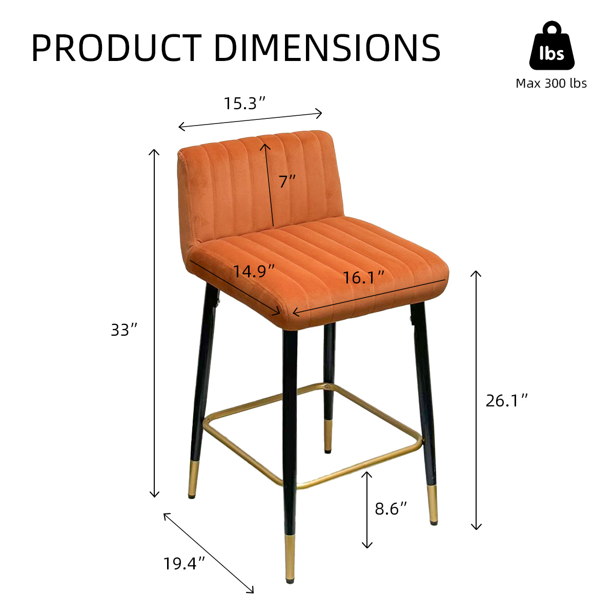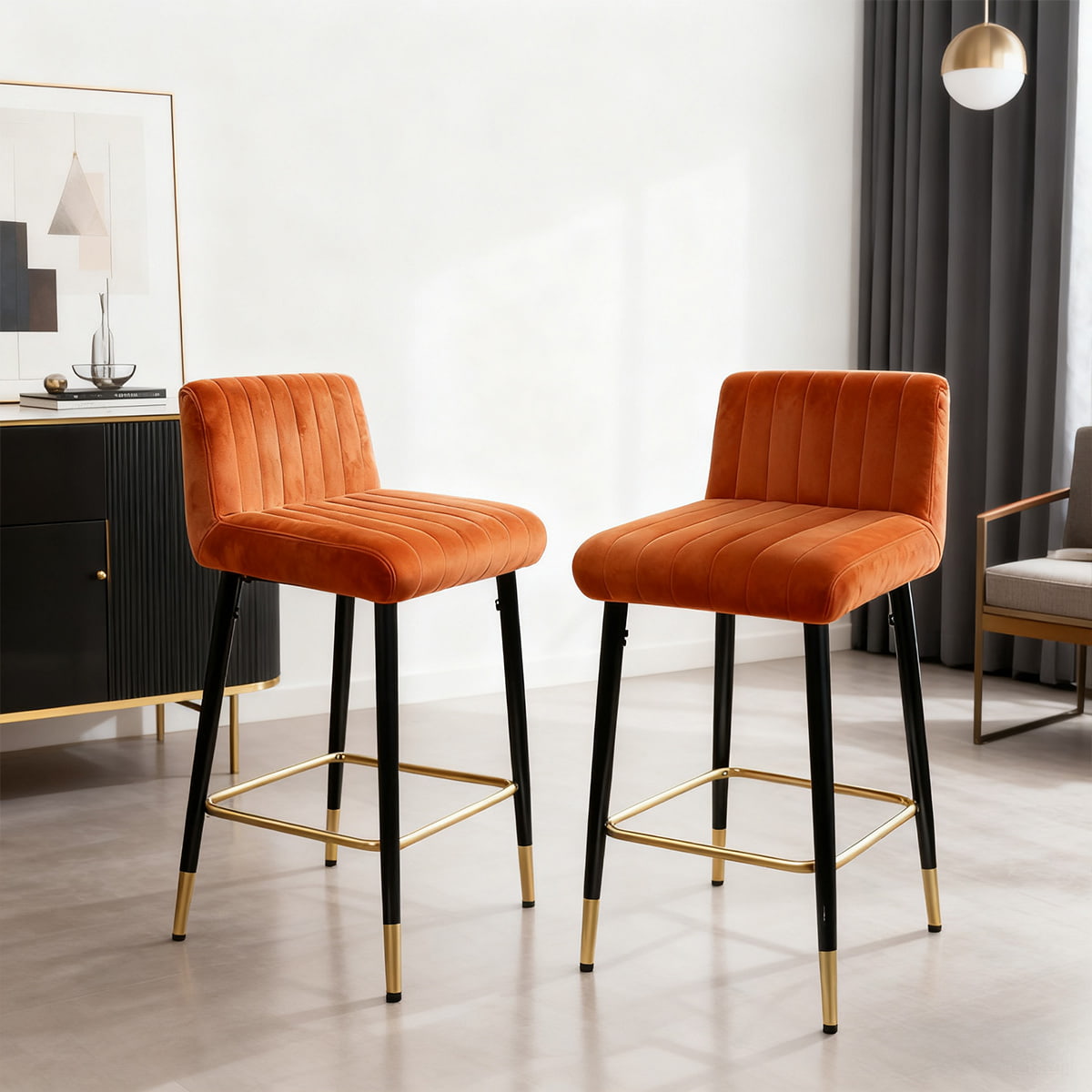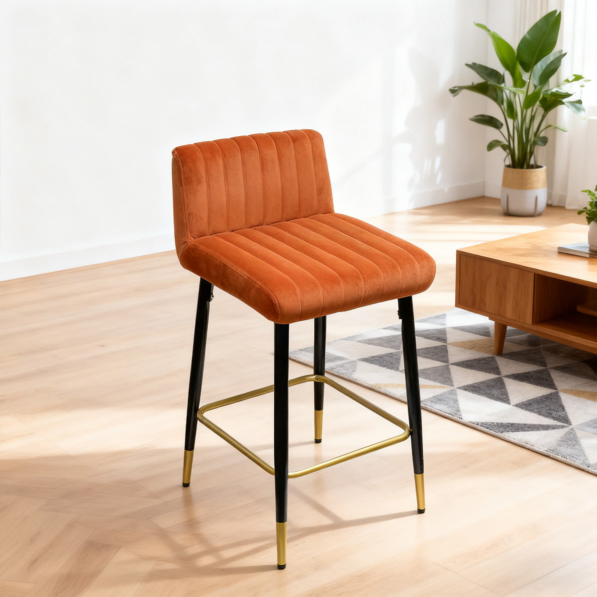 مقعد بار مخملي برتقالي مغرة حديث - كرسي ارتفاع دوار 360 درجة مع أرجل معدنية باللونين الأسود والذهبي، مقعد منجد ناعم ومسند للقدمين لجزيرة المطبخ، أو البار، أو غرفة الطعام