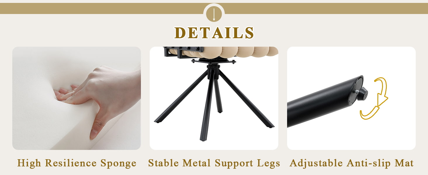 تم تصميم كرسي الطعام الدوار المخملي هذا لمساحات تناول الطعام الحديثة والديكورات الداخلية لأسلوب الحياة والبيئات التجارية البوتيكية. يتميز بمسند ظهر وسادة فقاعية منحوتة ومفروشات مخملية هولندية ناعمة، ويجمع الكرسي بين التصميم الجذاب والراحة اليومية. تسمح وظيفة الدوران 360 درجة بحركة مرنة، بينما توفر الأرجل المعدنية القوية والقاعدة بدون عجلات ثباتًا موثوقًا لغرف الطعام وغرف المعيشة ومناطق المكياج ومقاعد المقهى. يساعد الظهر المنحني المريح والوسادة الإسفنجية عالية المرونة على توزيع ضغط الجسم بالتساوي، مما يوفر دعمًا مريحًا أثناء الجلوس لفترات طويلة.