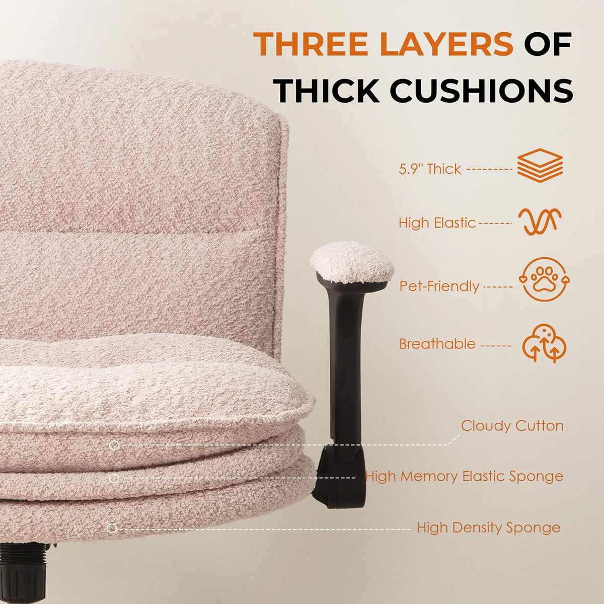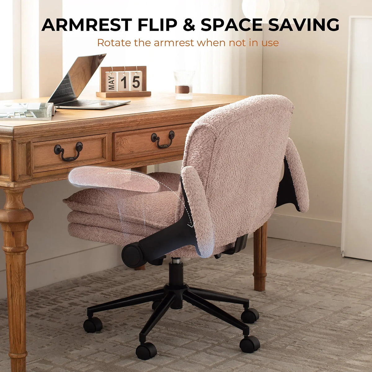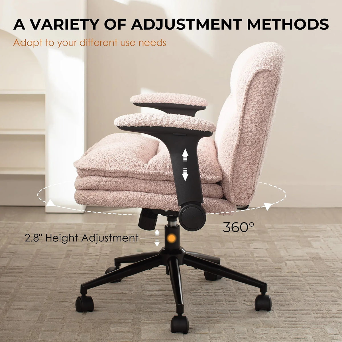 ② كرسي مكتب مريح ذو أرجل متقاطعة مع مساند للذراعين قابلة للتعديل، ووسائد دوارة 360 درجة وسميكة - كرسي المكتب المنزلي Bouclé