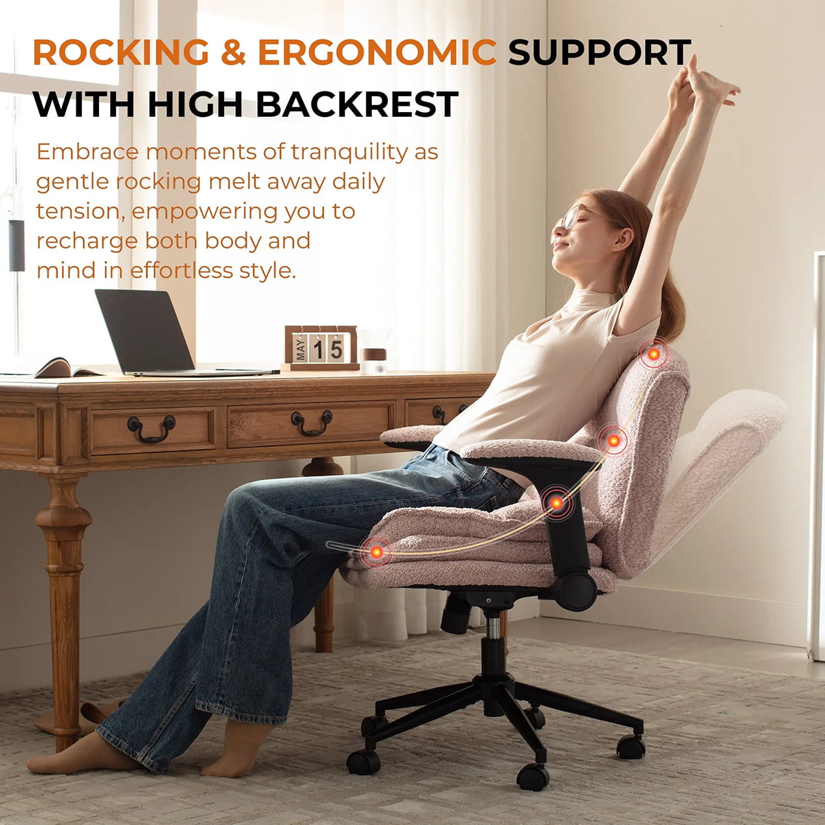 تتكيف الوسادة الهوائية القطنية الديناميكية مع حركة جسمك، مما يضمن الدعم المناسب للعمود الفقري خلال ساعات طويلة من العمل أو الدراسة أو الألعاب أو إجراءات الماكياج. دوران سلس 360 درجة، وتعديل الارتفاع 2.8 بوصة، وهزاز 90 درجة - 120 درجة، وعجلات صامتة تسمح بتحولات سهلة طوال يومك.
